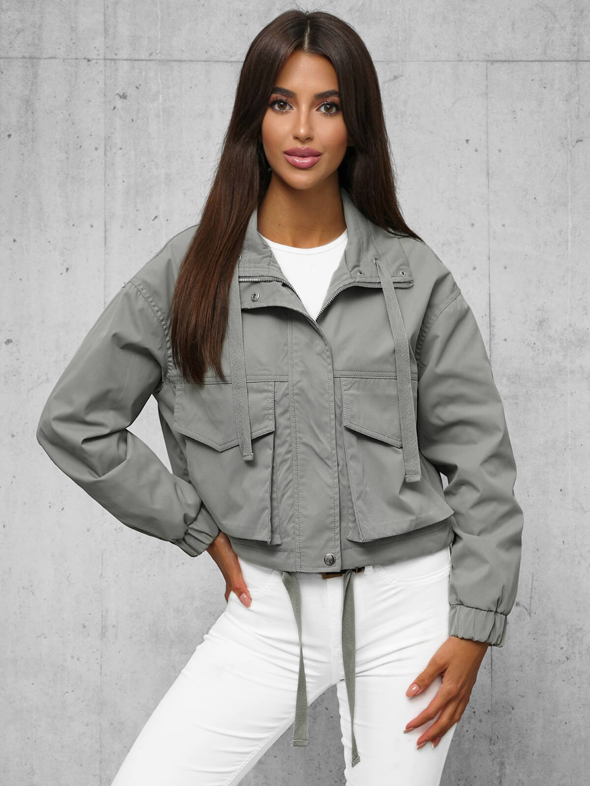 Представеното дамско преходно сиво яке OZONEE O/G118 е комбинация от стил и комфорт. Тази елегантна и функционална дреха е идеалното допълнение към вашия есенен и пролетен стайлинг. Якето се закопчава с цип и копчета за притискане, което гарантира удобство и практичност при носенето му. Високата яка тип "комин" предпазва врата ви от студа, а джобовете отстрани ви позволяват да съхранявате дребни предмети.