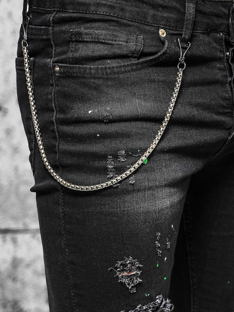Тези уникални мъжки дънки с тясна кройка са комбинация от класика и модерност. Те се приспособяват към силуета, като подчертават неговите предимства и гарантират удобство при носене. Модерното протриване придава характер, а декоративната верижка за сваляне е детайл, който привлича вниманието. Джобовете отпред и отзад са не само практични, но и неразделна част от дизайна на тези панталони.