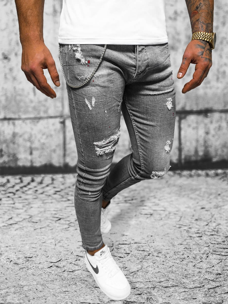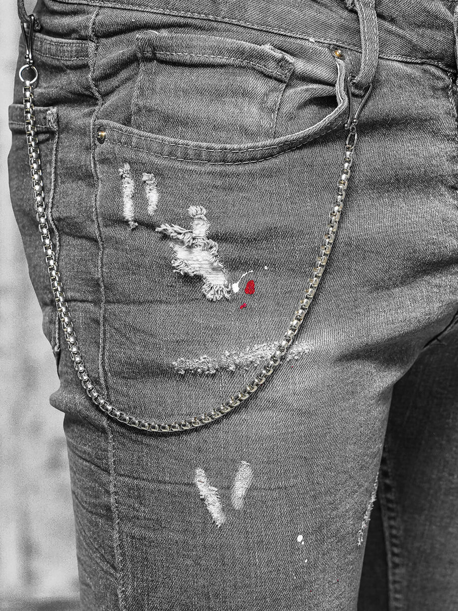 Тези уникални мъжки дънки с тясна кройка са комбинация от стил и комфорт. Те прилепват плътно, подчертавайки силуета, като същевременно позволяват свобода на движенията. Модерното протриване придава характер, а декоративната подвижна верижка е привличащ вниманието детайл, който подчертава индивидуалния стил. Джобовете отпред и отзад са не само практични, но и представляват интересен декоративен елемент.