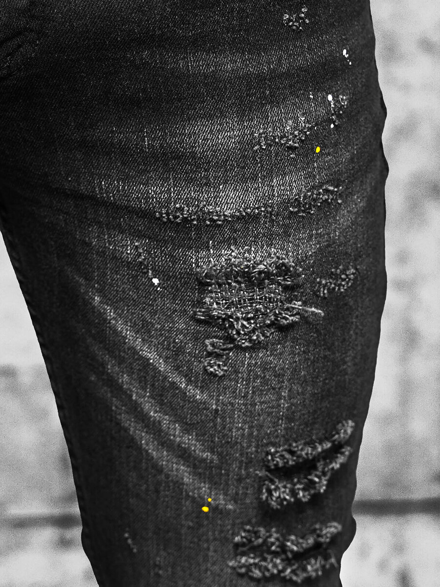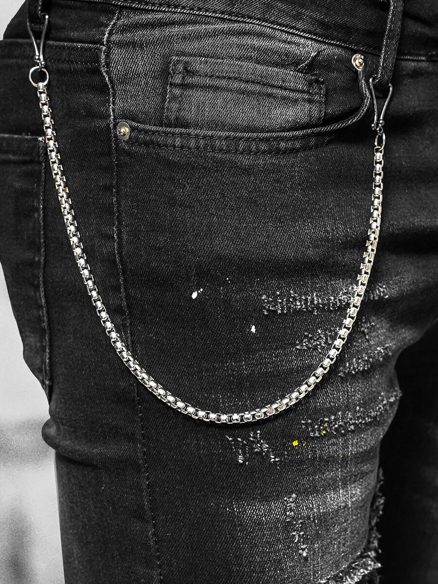 Тези мъжки дънки с тясна кройка са комбинация от комфорт и модерен дизайн. Те прилепват плътно, подчертавайки силуета, като същевременно позволяват свобода на движенията. Модерното протриване придава характер, а декоративната подвижна верижка е детайл, който привлича вниманието. Джобовете отпред и отзад са не само практични, но и представляват декоративен елемент.