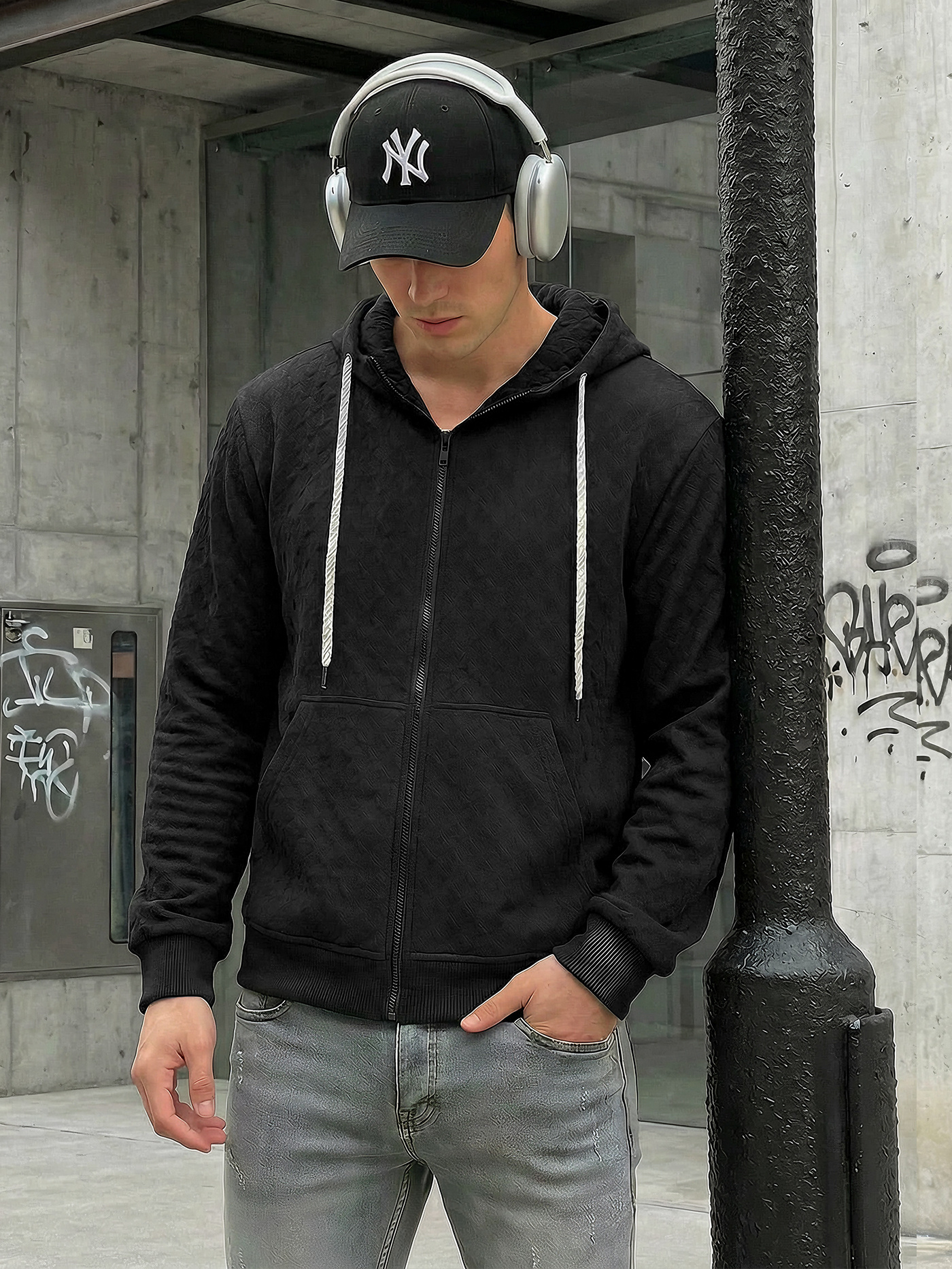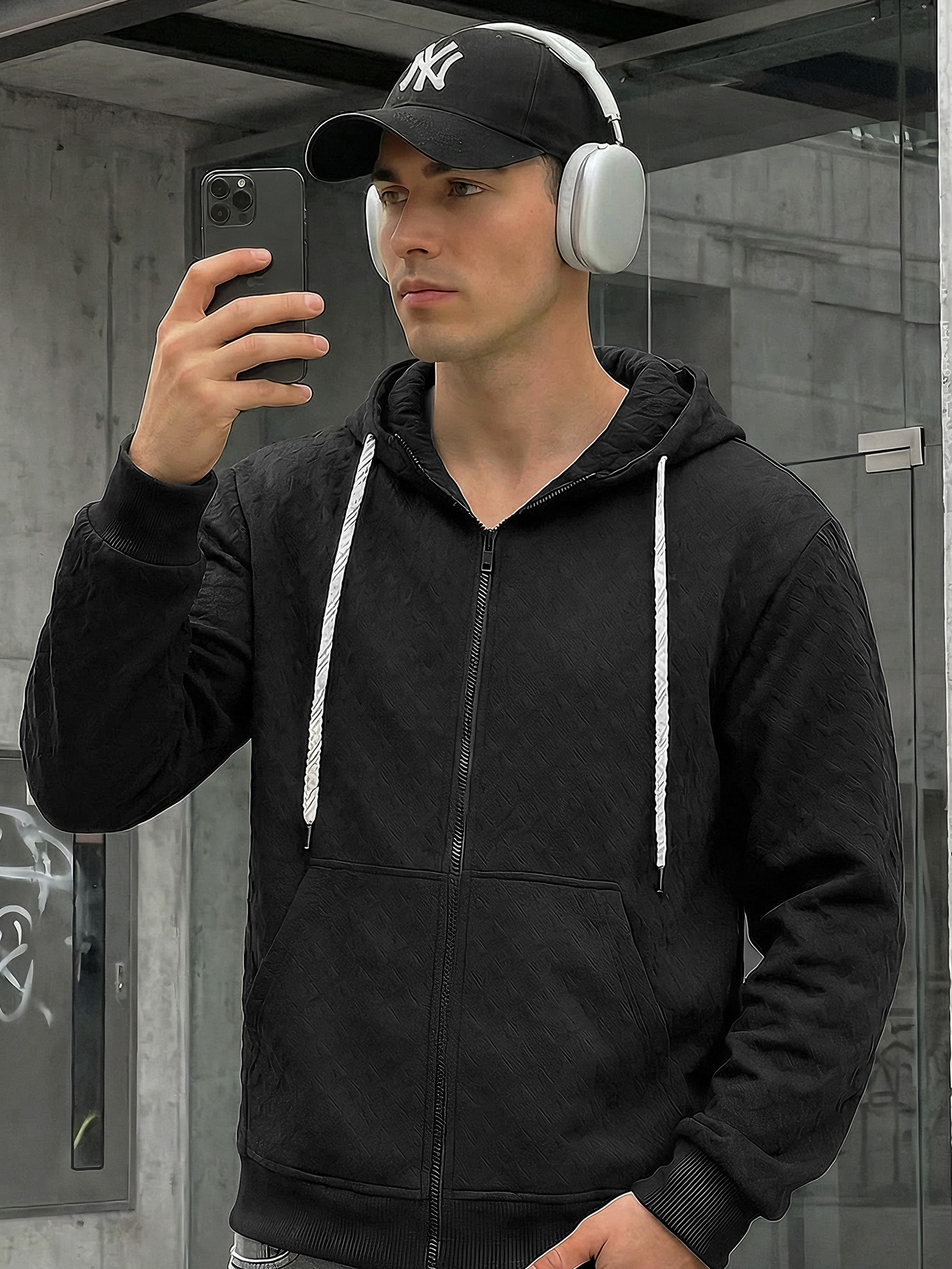 - Мъжки суитшърт с цип и качулка с връзки за регулиране